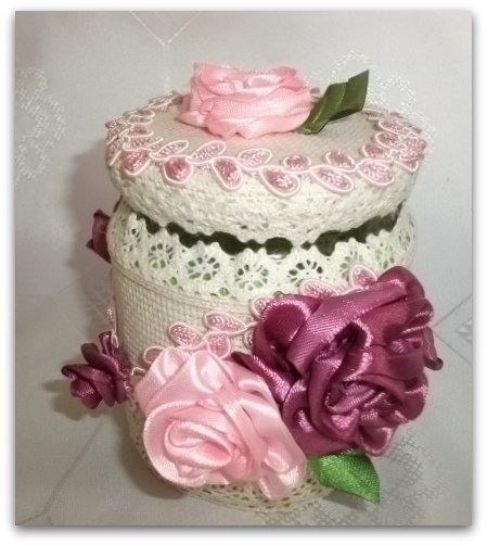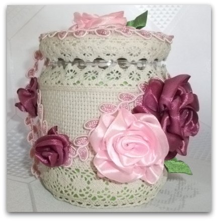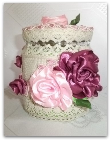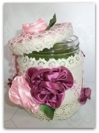Ez a kedves, kézzel készített rózsákkal és csipkével díszített üvegcse kiváló ajándéktárgy vagy lakásdekoráció lehet. Hangulatával melegséget áraszt, cukorkák vagy egyéb apróságok tárolására alkalmas. A teteje levehető.