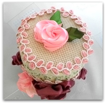 Leírása: Kézzel készült rózsákkal és csipkével díszített üvegcse, elsősorban cukorkák tárolására, kínálására alkalmas.