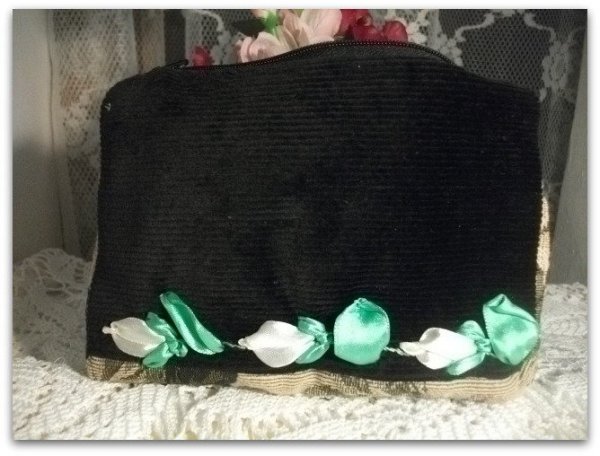 Leírása: Fekete bársony alapon gobelin anyagbetéttel. Szalaghímzéssel készült virágokkal díszítve. Cipzáras. Bélése vatelin, virágmintás pamutvászon.