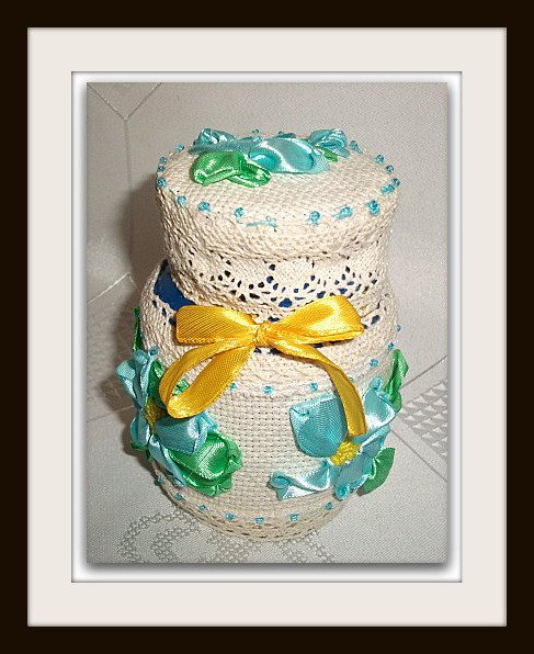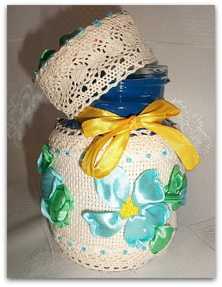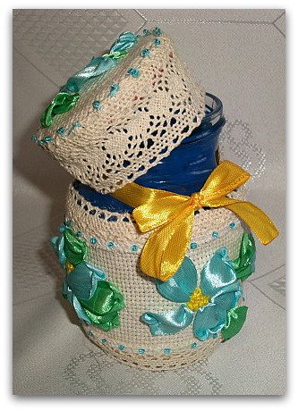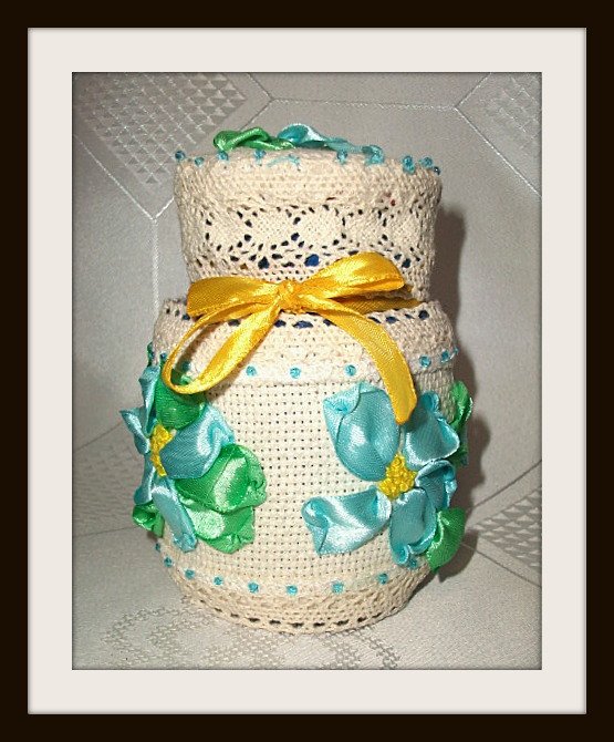 Leírása: Csipkével és kézzel készített szalaghímzéses virágokkal díszített, festett üvegcse. Cukorka, fűszer vagy egyéb apróságok tárolására alkalmas.