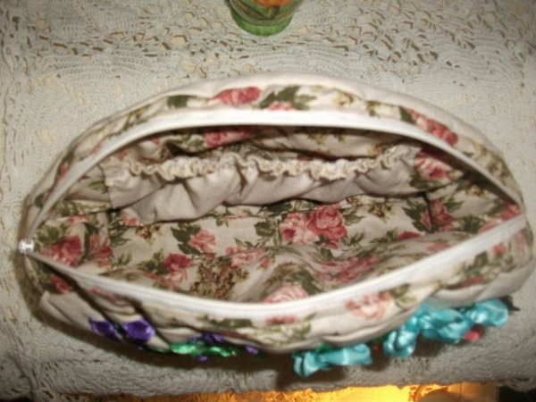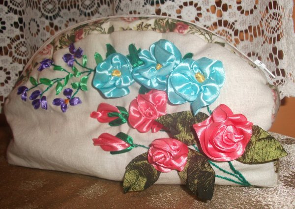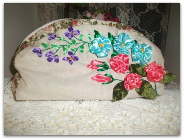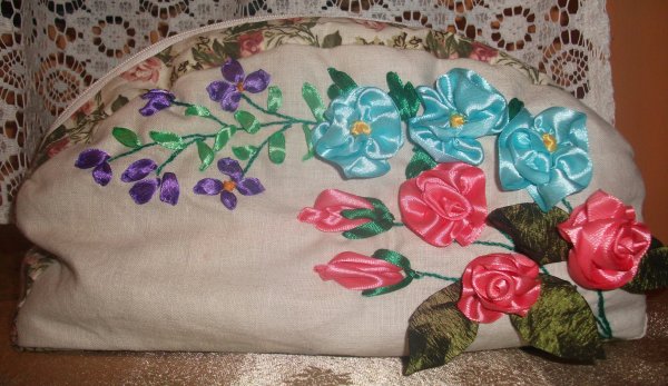 Leírása: Nyers vászon alapon szalaghímzéssel készült díszítés. Igen mutatós. Belseje vatelin és pamutvászon. Cipzáras. Fürdőszobába, női holmik tárolására kiváló.