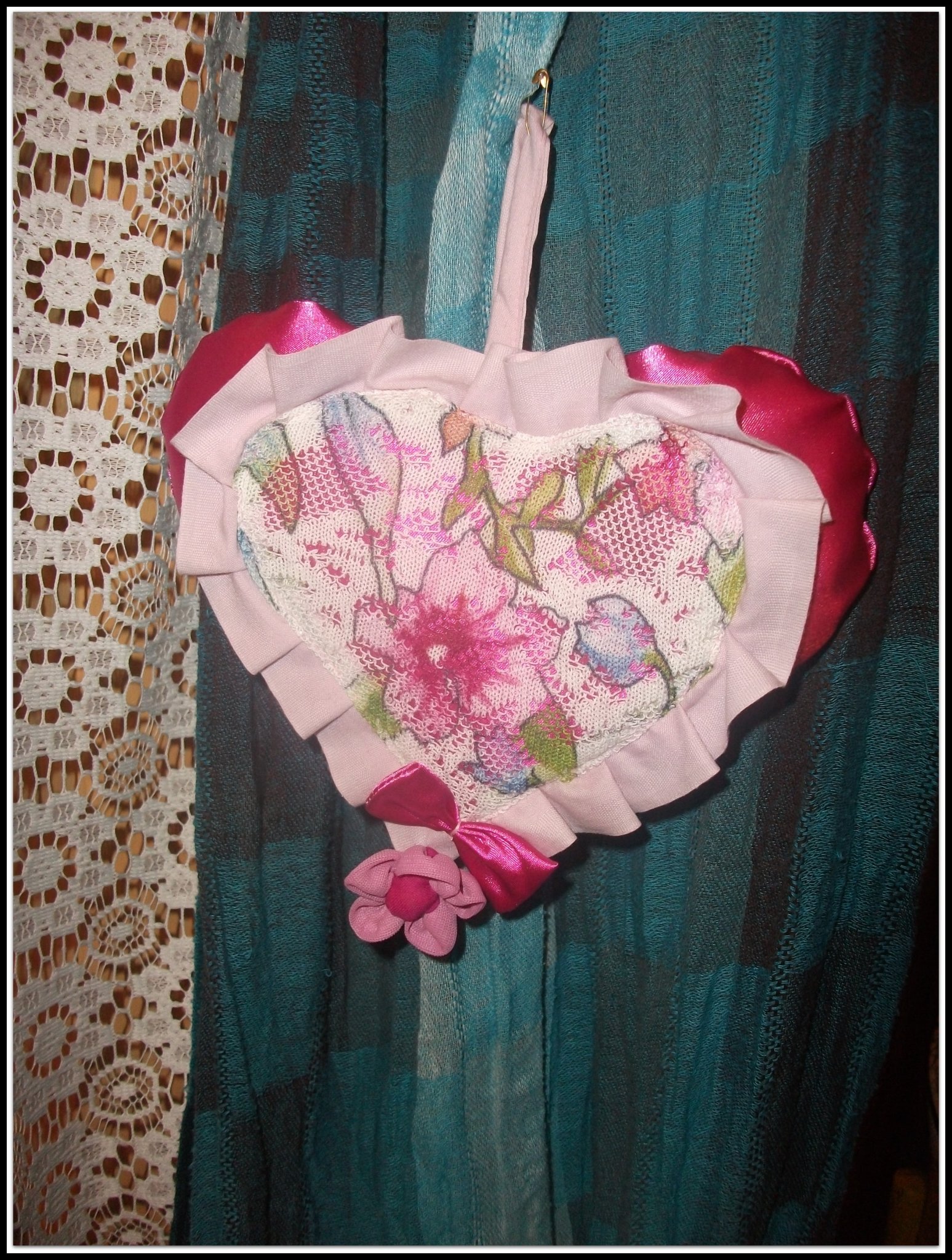 Leírása: Vatelinnel bélelt szívecske. Selyemből készült, fodorral és virágdíszítéssel.