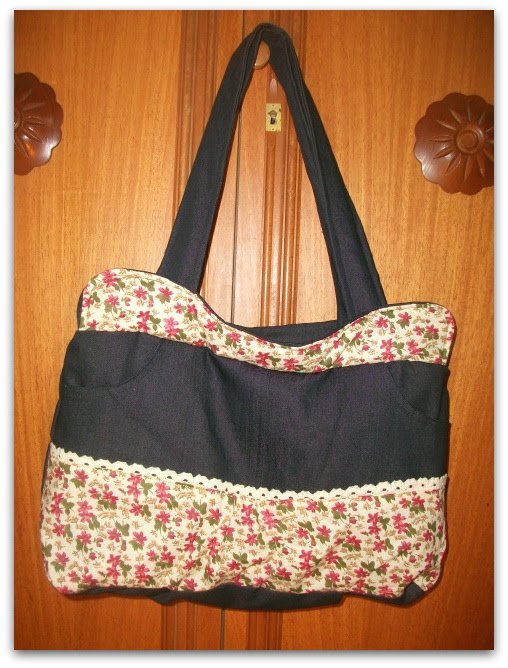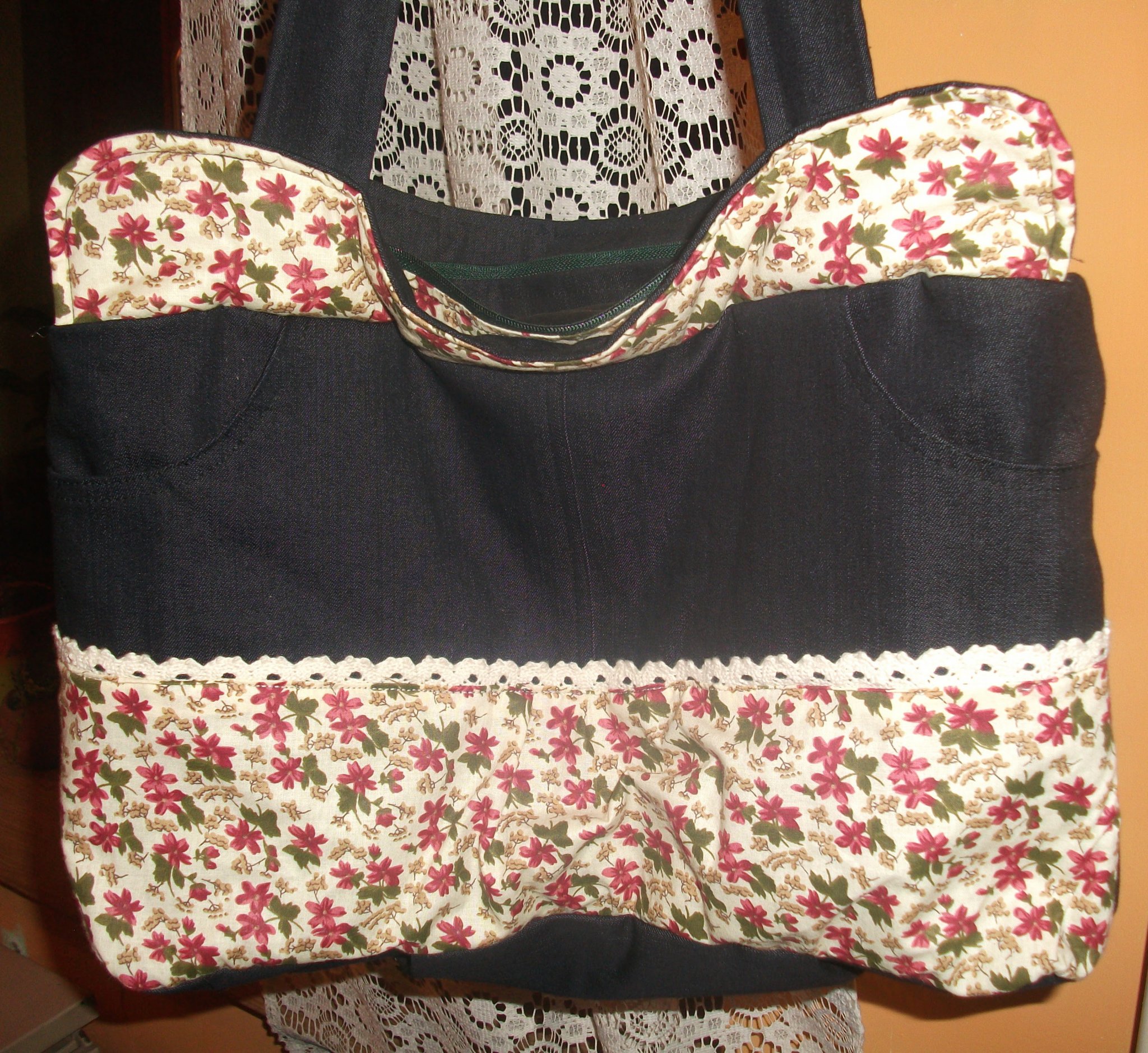 Leírása: Vállra akasztható pakolós farmertáska virágmintás pamut betéttel, nyers színű csipkével, két cipzáras zsebbel. Bélése vatelin és fekete bélésselyem. Cipzárral záródik, vatelinnel bélelt. Belső cipzáras zsebet tartalmaz és egy húzott zsebet.