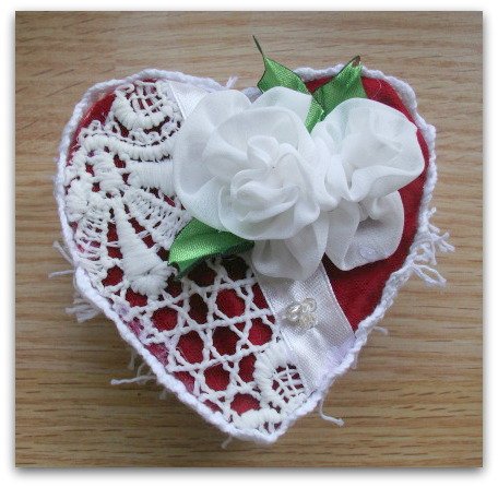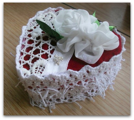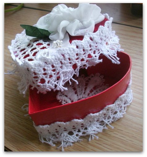 Leírása: Szívecske alakú ékszertartó karton dobozból, piros bársony és fehér pamutcsipke díszítéssel, fehér muszlin rózsákkal. Elsősorban a vintage stílus kedvelőinek ajánlom.